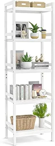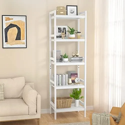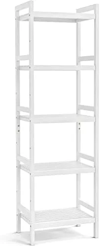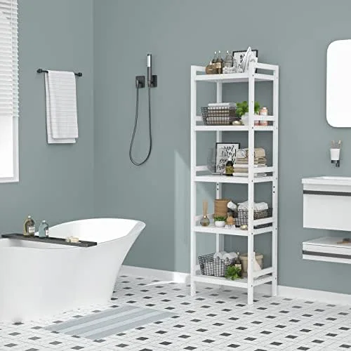 Homykic Bamboo Bookshelf, 5-Tier Narrow 55.9” Adjustable Book Shelf Bookcase Bathroom Shelves Freestanding Storage Stand for Living Room, Bedroom, Kitchen, Rust Resistance, Easy Assembly, White