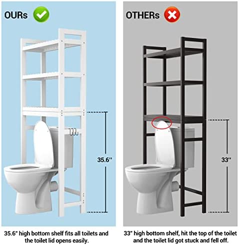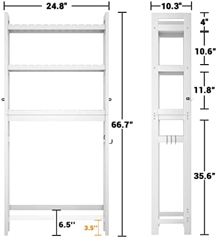 OVER THE TOILET STORAGE – With the bottom shelf 35.6″ from the floor, this 24.8” W * 10.3” D * 66.7” H bathroom shelf organizer fits most standard toilets, easily fits into space behind your toilet. It is a great idea to tidy toilet papers, shampoo, shower gels, towels, hairdryers, and plants. With 3 removable hooks for convenience use.