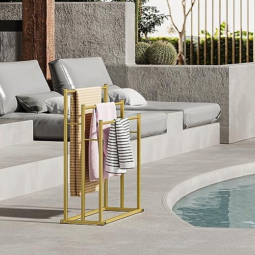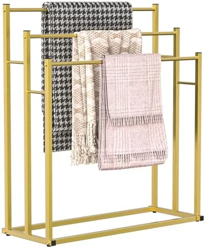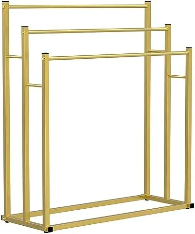 【Sturdy Construction】: This towel rack holder is made of high-quality and sturdy metal frame that is well-sanded and smoothed out without any rough edges. Its durable metal tube with a matte gold powder coat finish resists oxidation and rust, ensuring long-lasting use.
