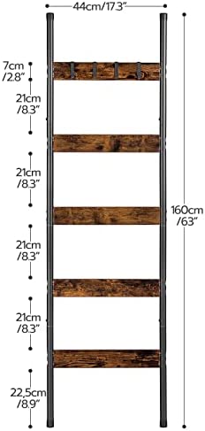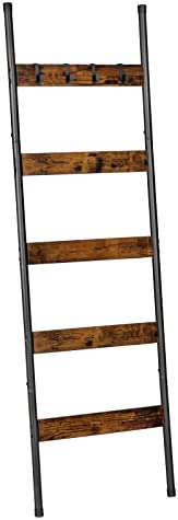 HOOBRO Blanket Ladder, 5-Tier Towel Rack with Hooks, Wall-Leaning Blanket Rack, Decorative Display Ladder Shelf, Scarves, Industrial, Living Room, Bedroom, Rustic Brown and Black BF52CJ01