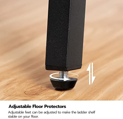 Built to Last: This ladder bookshelf is made of quality particleboard and sturdy metal legs. The metal frame 13.4″D x 25.2″W x 72.8″H provides excellent support. The elaborate trapezoidal frame and adjustable feet give you peace of mind when in use