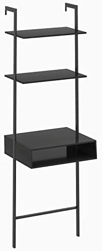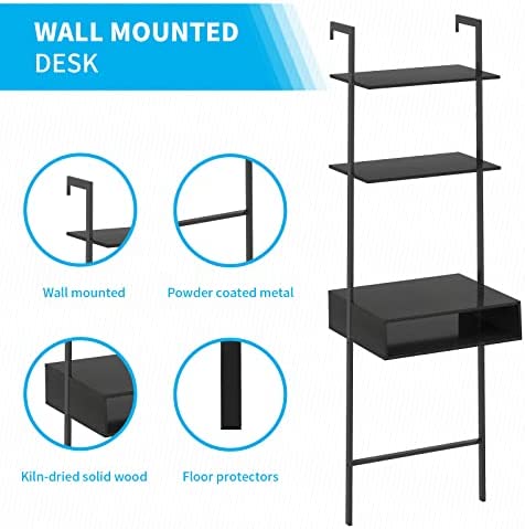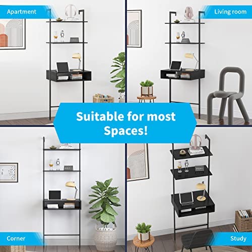 Horgaeo Wall Desk, 2-Shelf Wall Mounted Ladder Shelf Table, Small Computer or Writing Desk with Storage Drawer, Industrial Bookcase Easy to Assemble, Space Saver, Black