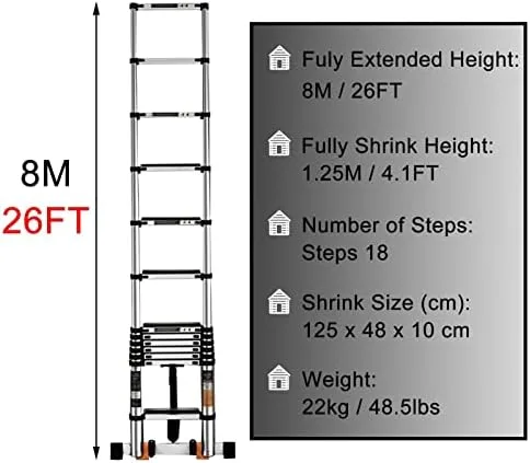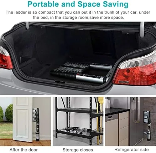 Whether you need a small boost or some serious height, the Telescopic Extension Ladder will get the job done. The high-quality extension mechanism allows you to adjust the height quickly and effortlessly. You can do anything with the ladder, such as decorating, installing and adjusting cameras, badminton, repairing roofs, installing and repairing streetlights, climbing trees, etc. You can also take it on the road for a trip.