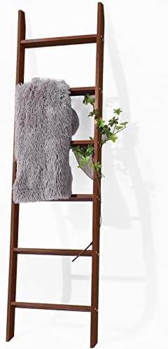 【MULTIPLE USES】Perfect for displaying throws, quilts, scarves, and ties! Turn your clutter into the decor! Our ladder shelf adds character to your living room and other spaces! Use the wooden ladder to hang multiple items at once. You can also display scarves, neckties, and wrapping in retail shops
