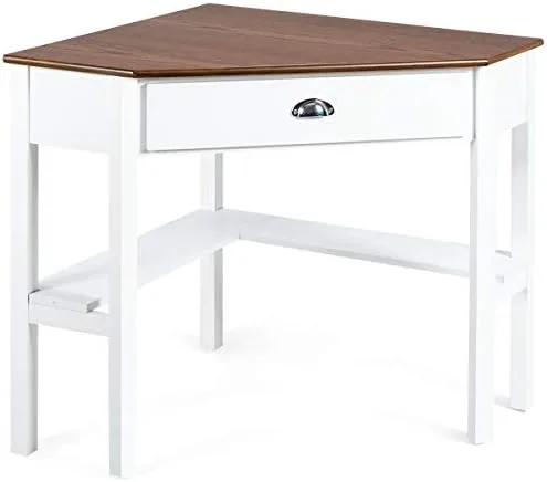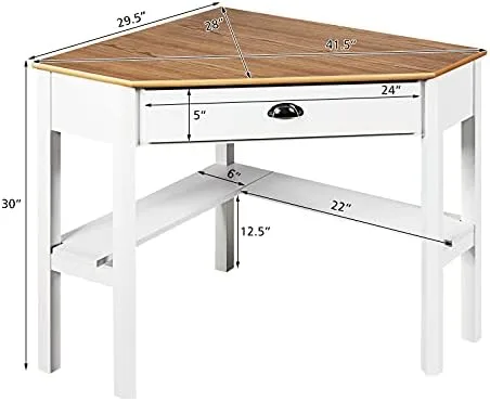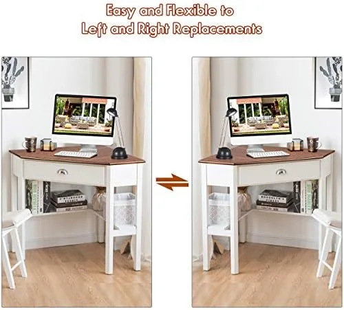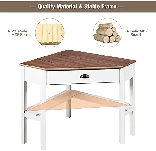 Are you in need of a space saving triangle desk for your limited space? Our corner desk is a great choice for you. The simple modern style brings elegance to your room. The triangle design fits with any corner and takes little space in your room. The spacious tabletop with drawer and shelves under offers enough space for daily use and storage. And the premium P2 and PB boards and pine wood legs ensure durability in a long time. Whether to put it in the entryway, living room, study or bedroom, it would serve the purpose well. Take one home and you would be very glad to recommend to your friends!