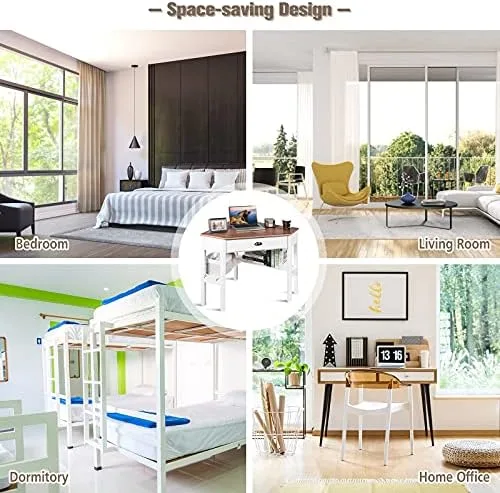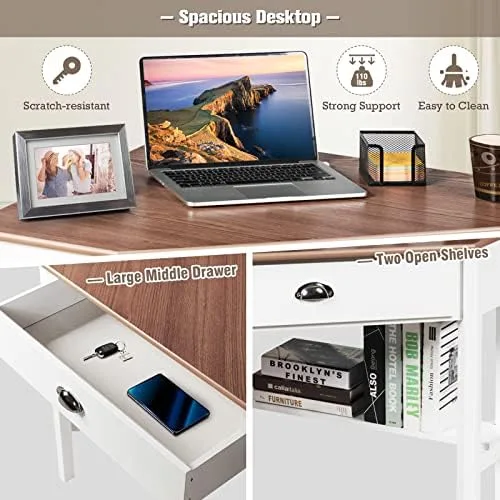 【Ample Storage Capacity】With a pentagonal tabletop measuring 29.5’’ on its longest sides, this desk provides ample space for your laptop, files, plants, and other work or study materials. Additionally, it features a drawer and two shelves underneath, offering sufficient storage for your daily needs.