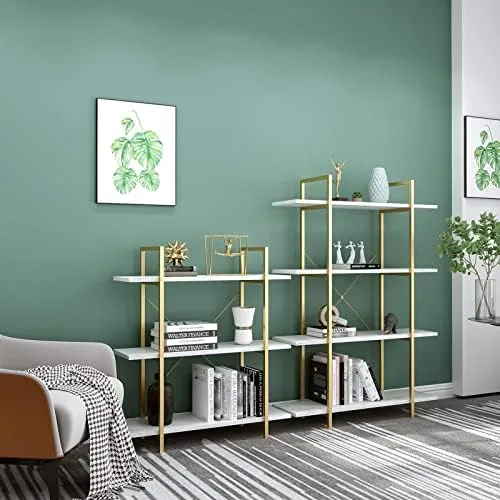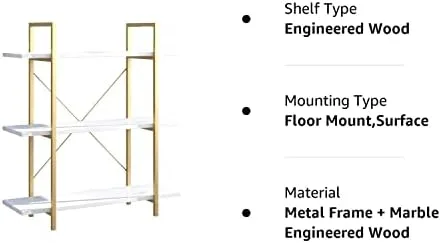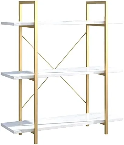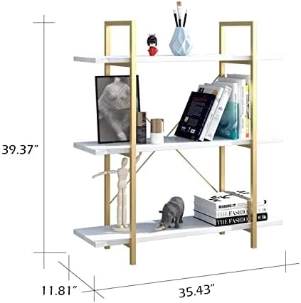 IOTXY 3-Tier Open Shelf Bookcase – Modern Freestanding Wooden Display Stand Unit with Metal Frame for Home and Office, Bookshelf, Gold White