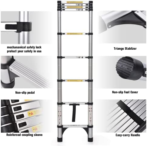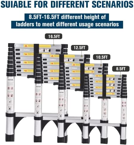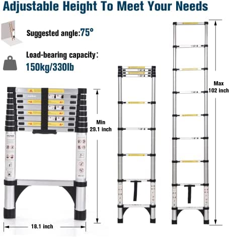 Versatility : The maximum height of the ladder is 8.5FT. Extension ladder can be used for daily housework as repairing ceiling lights, painting walls,cleaning the windows or cutting branches. Portable telescopic ladders are indispensable for regular maintenance of attic and house decoration
