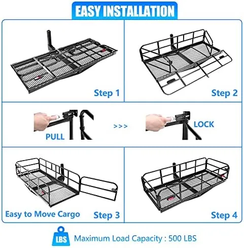 EASY INSTALLATION: Fits any 2″ trailer hitch opening, 500 Lbs distributed weight capacity. Works well if you distribute the weight evenly on platform when hauling a load, keep it balance for the cargo load or fix in the middle position.