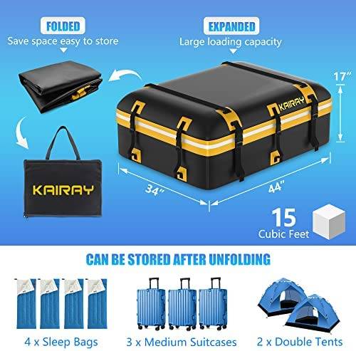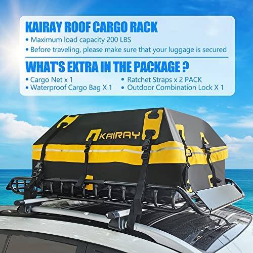 PACKAGE INCLUDED: Roof Cargo Rack x 1, Cargo Net x 1, Waterproof Cargo Bag with Storage Bag x 1, Ratchet Straps x 2 PACK, Outdoor Combination Lock x 1