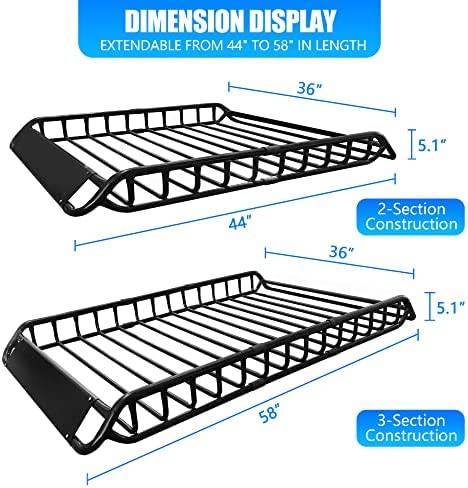 EXTRA LARGE SIZE & CAPACITY: The roof rack carrier is extendable from 44″ to 58″ in length.Overall Dimension : 58″(L) x 36″(W) x 5.1″(H); the size without extension: 44″(L) x 36″(W) x 5.1″(H).The roof rack basket can safely and reliably load up to 200Lbs of cargo.