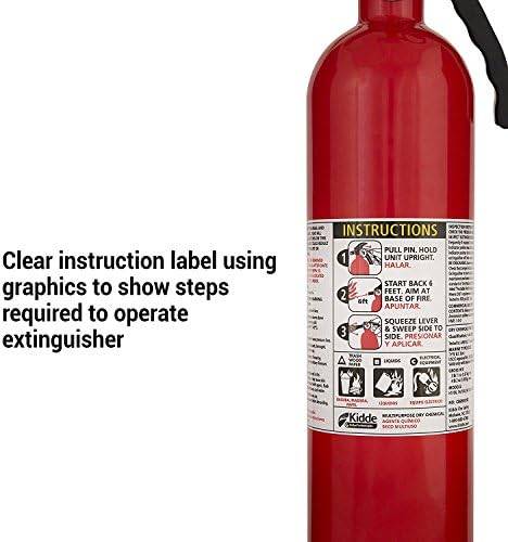Kidde multipurpose disposable home fire extinguisher spray, 1a: 10bc rating, 2.5 lbs., 6 per case The Kidde 1A10BC Basic Use Fire Extinguisher is suitable for use on Class A (trash, wood and paper), Class B (liquids and gases) and Class C (energized electrical equipment) fires. The recreational unit is made from lightweight aluminum with a tough nylon valve assembly and is fitted with a pressure gauge that provides at-a-glance status. The Kidde basic use fire extinguisher also includes an easy-to-pull safety pin and a clear instruction label on the front.Kidde 1A10BC Basic Use Fire Extinguisher, 2.5 lbs: Easy-to-read gauge tells you the fire extinguisher is charged and ready for use Clear instruction label using graphics to show steps required to operate extinguisher Easy-to-pull safety pin Rust- and impact-resistant nylon handle 2.5 lbs of fire extinguishing agent (average) 6-year limited warranty Can be used on Class A (trash, wood and paper), Class B (liquids and gases) and Class C (energized electrical equipment) fires Dry chemical fire extinguisher made from lightweight aluminum with a durable nylon valve assembly