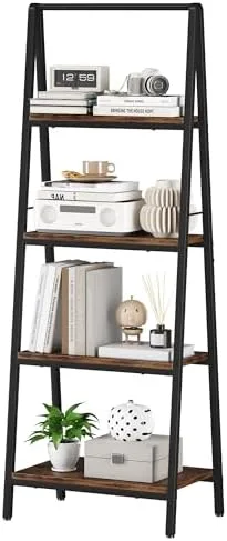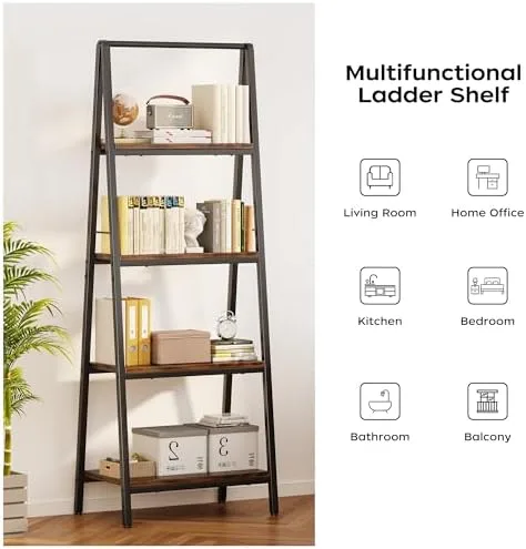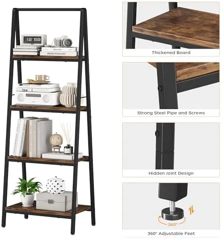 [Premium Material]-Crafted with a robust steel frame and quality MDF board, this 4-tier bookshelf is durable for long-term use.The surface is painted so that the wood of this tier ladder shelf will not hurt hands and the iron pipe will not rust.The adjustable foot at the bottom allows it to be placed firmly on any uneven ground without tilting or collapsing.
