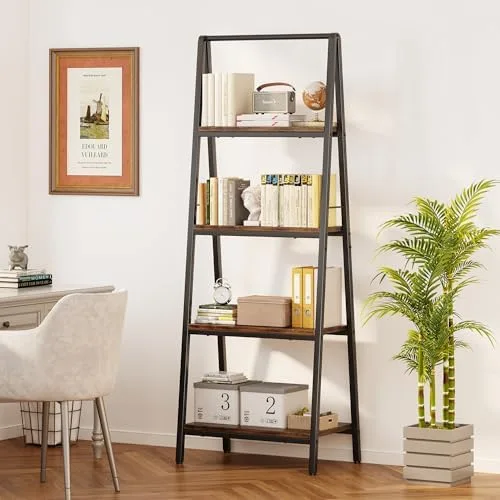 YIJIALEA Ladder Shelf, 4-Tier Leaning Ladder Bookshelf, Rustic and Wood Ladder Shelf Bookcase, Industrial Ladder Shelf Storage Rack for Home Office, Bedroom, Bathroom or Kitchen