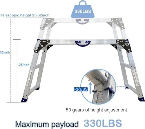 【Adjustable Height】Adjustable Work Platform Height 25 to 35 inches,the height is adjustable in 50 gears, Can be adapted to various scenarios. Portable olding Aluminum Step Ladder of Capacity 330 LBS Heavy Duty