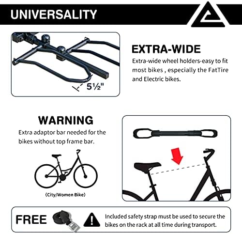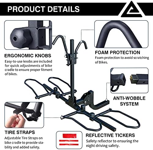 [ BIKE COMPATIBILITY ] – Easily transports up to 2 bikes and is compatible with 2″ hitch receiver. Fits most frame sizes, shapes and style including Fat Tire and Electric Bikes . Bikes with low Y-frame may require the use of an Bike Frame Adapter for better support .Maximum capacity of 70Ibs per bike.