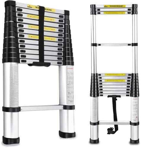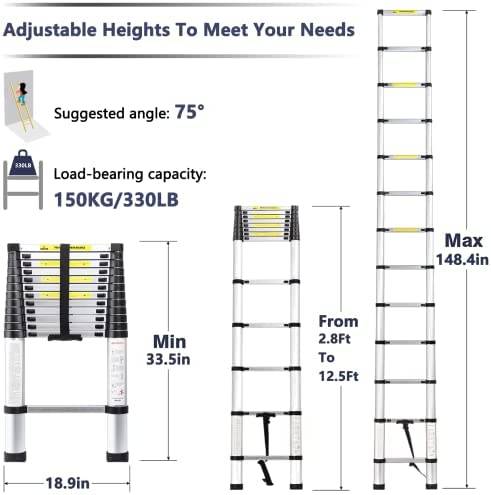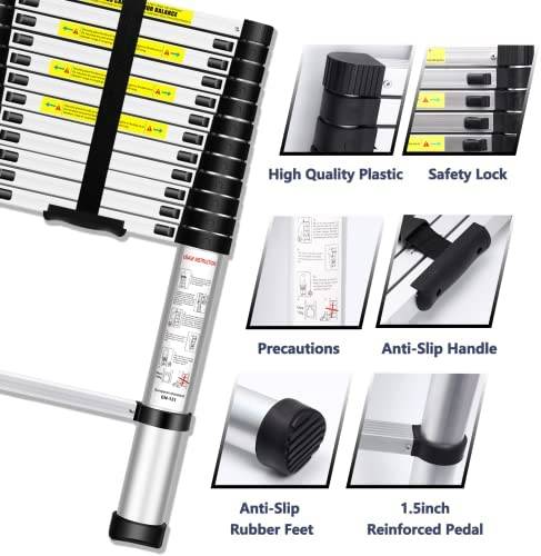 LOOBMBNS Telescopic Extension Ladder, Aluminum Telescoping Ladder 12.5 FT, Multi-Purpose Compact Collapsible Ladder with Non-Slip Foot Cover& Locking Mechanism, 330 Lb Capacity