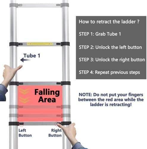 🌞 NOTE: Dear customer, When ladder retracting, Do not place any part of the body including hands or fingers in the area where the ladder falls. Prevent the falling part of the ladder from hitting your fingers.