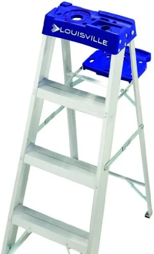 A 10-foot medium duty aluminum stepladder with a 250 lbs. load capacity. Now features Louisville exclusive “Pro Top” designed with innovative features to improve the user’s performance when working electrical, utility, heavy construction, and residential jobs Pro top includes a magnet tray, hardware tray, curved ergonomic front, drill and tool slots, paint bucket holder, and a pipe or 2×4 holder to increase productivity. This ladder features slip resistant rubber feet, aluminum angle feet with thick rubber tread on all four legs to provide sure footing Pinch resistant spreader braces, heavy duty plated steel spreader braces with double rivet hinge protect user from pinched fingers.