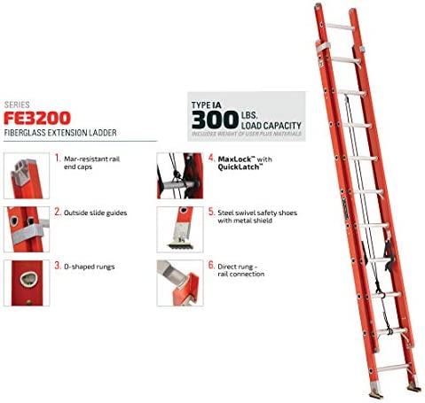 Louisville Ladder FE3216 Fiberglass Extension Ladder 300-Pound Capacity, 16-foot, Type IA, Orange