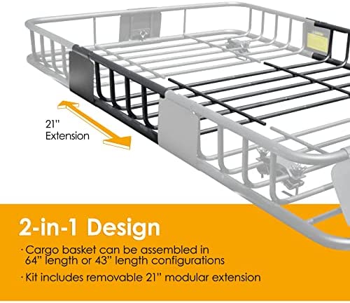 Basket Dimensions: Large Rack with extension, 64″L x 39″ W x 6″ H or Standard Rack, 43″x39″x6″ for smaller Roof size; Allows Travel with Excess Cargo like Luggage, Camping Equipment, Bags, Box; Included Steel Wind Fairing reduces wind resistance & noise