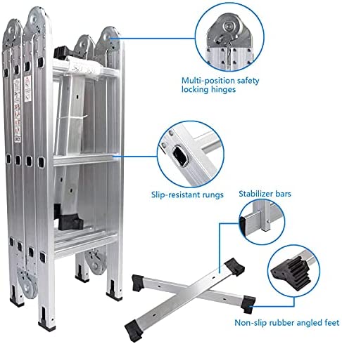 SAFE AND RELIABLE | Heavy-duty aircraft-grade aluminium construction; square rungs and supporting tubes, make this folding ladder stable and durable; meets EN131 standard; maximum load capacity is 330LB