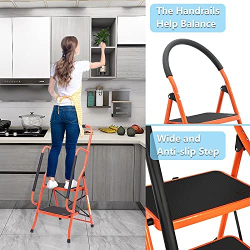 LUISLADDERS Step Safety Ladder Folding Anti-Slip Steel Safety Ladder Padded Side Handrails with Large Area Pedals for Kitchen Home and Office 500lbs (2 Step)
