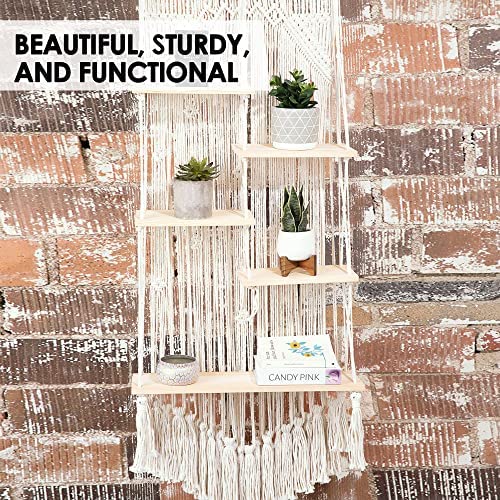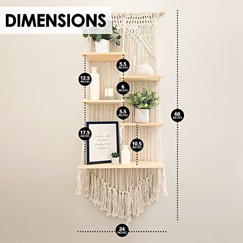 PERFECT IDEA TO DISPLAY ON YOUR SHELF: This product is made to show your small decorations such as books, plants, pictures,collectibles, vases, bowls, jars, cosmetics, lotion, soap, towels, tissue box, toilet paper, and more.This long macrame hanging shelf can be quickly installed within 10 mins after receiving. This beautiful large hand woven shelf displays your valuable and sentimental belongings for family and friends.