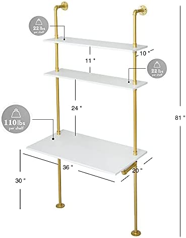 MAIKAILUN White and Gold Desk, 36" Ladder Desk, Wall Mount Computer Writing Table Pipe Shelf Shelving Mini Narrow Industrial Modern for Small Spaces(36x20x81)