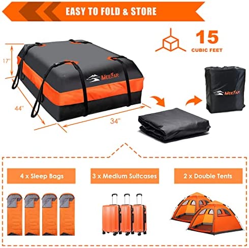 LARGE STORAGE SPACE -15 cubic feet 44” (L) X 34” (W) X 17” (H) rooftop cargo bag allows you to hold 4-6 suitcases, travel luggage case, tents, sleeping bags and more.