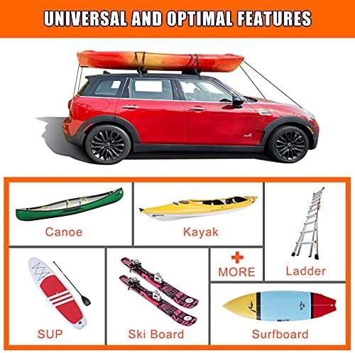 TIGHTER AND SAFER – 2 * 15ft tie-down adjustable straps with padded cam locks provide secure gripping for your load. 2 * 15ft bow & stern tie-down rope ensure that your long-loads are safely secured to the front and back of your vehicle. it holds up to 1-3 shortboards/ 1-2 longboards or kayaks depending on size.
