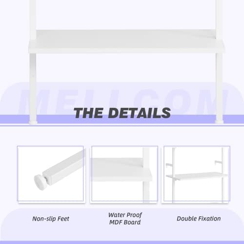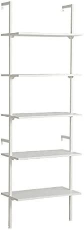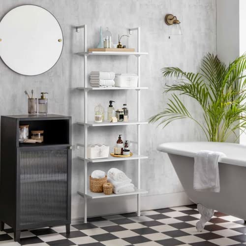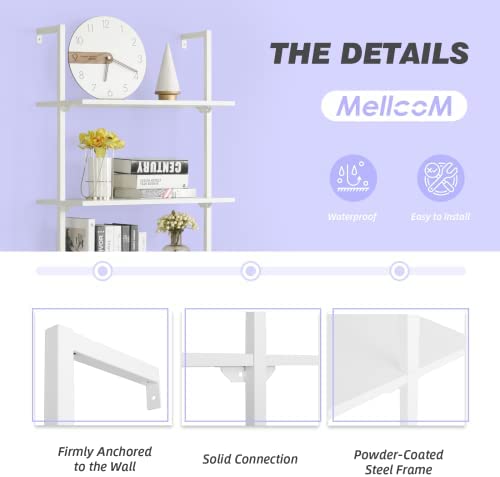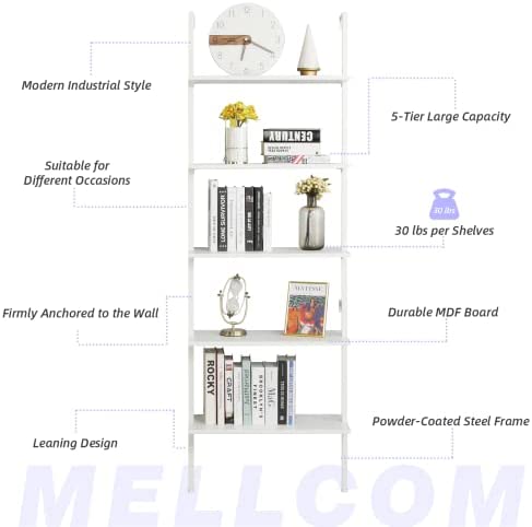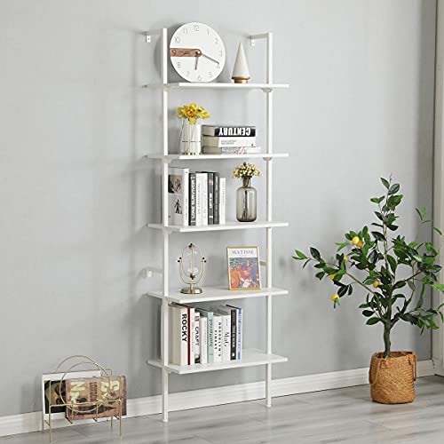 MELLCOM 5 Tier Industrial Ladder Shelf, Wood Modern Bookshelf with White Metal Frame, Wall-Mounted Plant Flower Storage Organizer for Living Room, Bathroom, Kitchen, Balcony