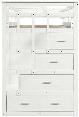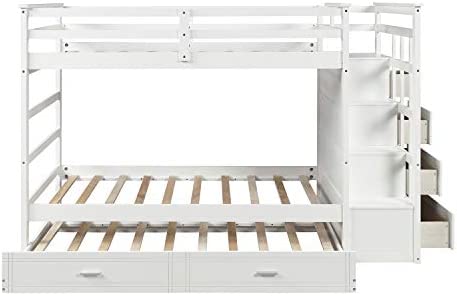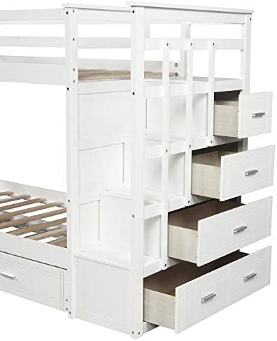 Merax Hardwood Twin-Over-Twin Bunk Bed with Trundle and Staircase, Trundle Bunk Bed with 4 Storage Drawers (White)