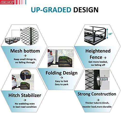 Overall Dimensions:60″(L) x 24″(W) x 14″(H). This hitch mounted cargo carrier 14″ high walls around the cargo carrier to keep your luggage secure during the journey and offer vertical support for optimal load balancing. It also features a mesh base to easily clean up messes.