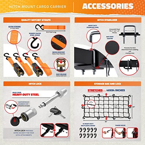 The car trailer hitch carrier is constructed with heavy duty rust proof steel and has the capacity to hold up to a hefty 500 Lbs of cargo such as luggage carrier or camping gear and any construction material. The waterproof cargo carrier bag that is approximately 58″ L X 20″ W X 24″ H and 16 cu ft. ✅ 1 Year Limited Warranty – Our customers are our #1 priority. If you have questions or concerns about your cargo carrier please contact us and we will resolve any issues you may have. Carry your cargo in style!
