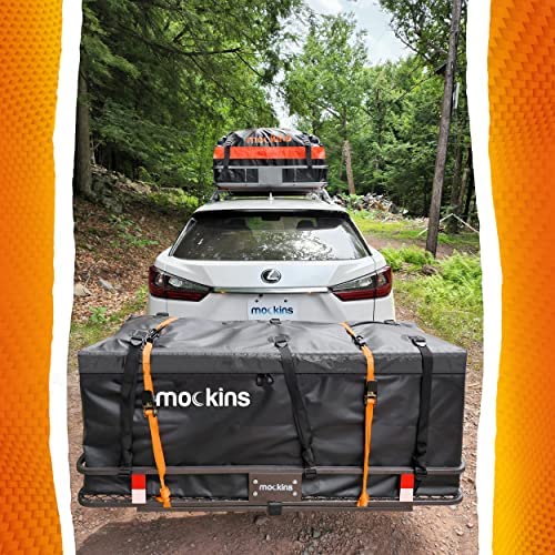 Mockins 60x20x6 Folding Cargo Carrier Hitch Mount Steel Cargo Basket |500lb Capacity Hitch Mount Cargo Carrier | Trailer Hitch Cargo Carrier & 16cu Waterproof Cargo Bag & Net| Hitch Rack Cargo Trailer