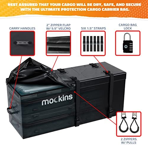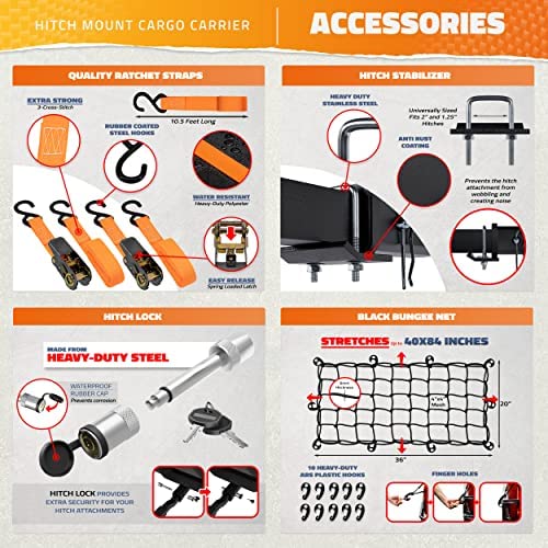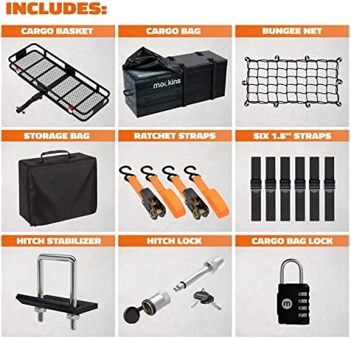 Includes a 16 Cu Ft waterproof cargo bag that is 58 X 20 X 24 inches + a storage carry bag for your cargo bag and accessories, making it easy to store mess free + 2 rainproof ratchet straps, an extra-thick 6mm heavy-duty cargo net, hitch stabilizer & hitch lock for added security for your trailer hitch great vehicle cargo baskets ✅ 1 Year Limited Warranty – Our customers are our #1 priority. For questions or concerns about your Carrier please contact us and we’ll resolve any issues you have