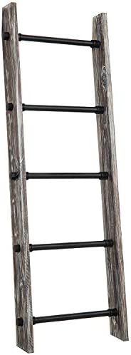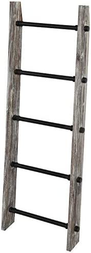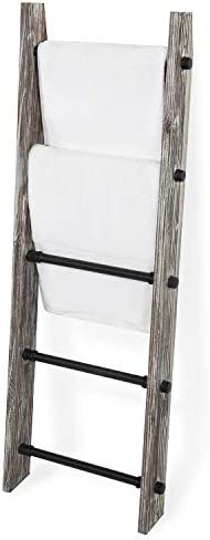 Add functional storage and unique rustic decoration to your home with this 4 foot tall rustic torched wood and black metal industrial pipe towel and blanket ladder storage rack. This ladder shelf rack provides 5 rungs for hanging towels, blankets, quilts, or even to be used as a portable clothing valet. Easy to lean against any wall surface without the need for installing onto the wall, this stylish burnt wood and black metal storage rack can be conveniently carried around the room and displayed in your bathroom, laundry room, living room, bedroom or kitchen. **Some assembly required**Approximate Dimensions: Overall – 53.75 H x 18.0 W x 4.0 D; Each Rung – 15.75 W x 1.0 Diameter; Space Between Rungs – 10.25 H (in inches)