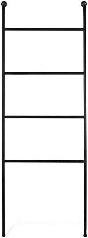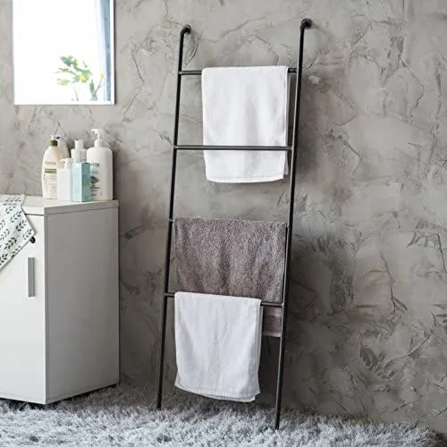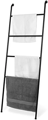 A unique yet efficient way to store or display towels, blankets, or quilts in the home or retail setting, this ladder-style towel rack adds a unique touch to any space. Featuring 4 wide rungs for drying or storing towels, this leaning rack can also be used as a valet for outfits, and its tight angle to the wall allows it to fit into small spaces. Adjustable feet accommodate uneven or textured floors, and the top flanges can be secured to the wall for added stability. Add abundant storage with minimal space and maximum style with this modern leaning towel rack. **Official MyGift product.**