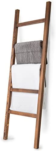 MyGift Rustic Brown Wood Leaning Blanket Ladder Holder with 5 Hanging Rungs, Farmhouse Towel Ladder for Bathroom Storage, Freestanding 4 Foot Leaning Rack