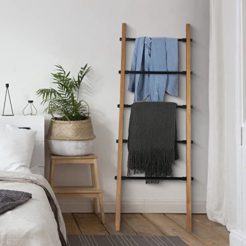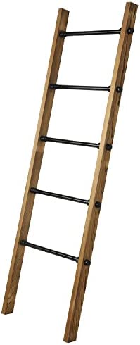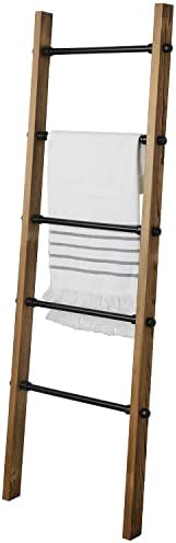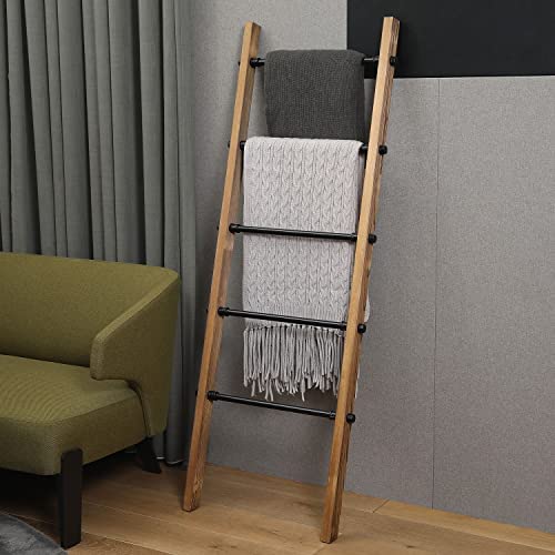 MyGift Rustic Burnt Wood Throw Quilt Blanket Ladder Farmhouse Style with 5 Black Metal Rungs, Bathroom Towel Ladder Storage Rack