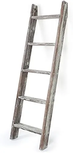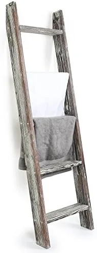 MyGift Torched Brown Wood Decorative Ladder Shelf, 4.5 Foot Wall Leaning Wooden Towel Blanket Ladder Storage Rack for Bathroom or Living Room