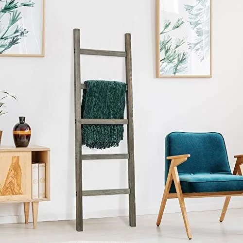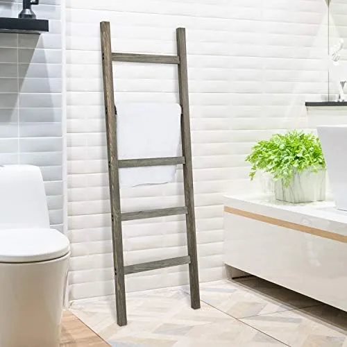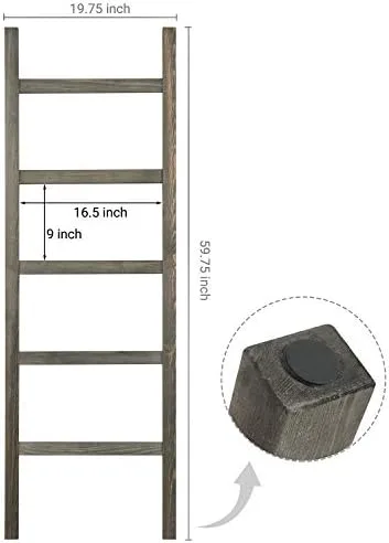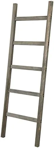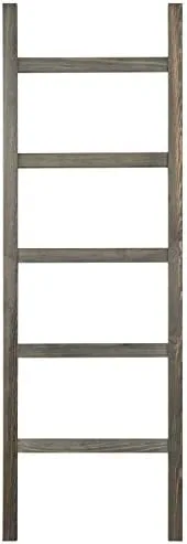 Featuring an impeccable combination of functional storage and country-tinged style, this wall-leaning dark gray rustic barnwood ladder rack is an excellent way to store towels, blankets and quilts in your bathroom or laundry room. This ladder storage rack provides 5 rungs for hanging items, its rustic dark gray wood construction is a great way to add a touch of charming country-themed accent to any home decor. Its wall-leaning design requires no installation and includes 2 anti-slip pads to prevent scratches to floor surfaces, and is lightweight enough to be carried around the room and used as a clothing valet. **Not to be used for climbing** **Some assembly required**Approximate Dimensions: Overall – 59.75 H x 19.75 W x 1.25 D; Each Rung – 16.5 W; Space Between Rungs – 9.0 H (in inches)