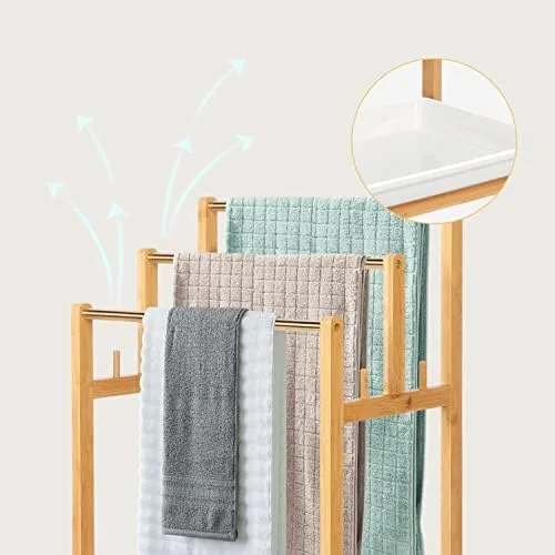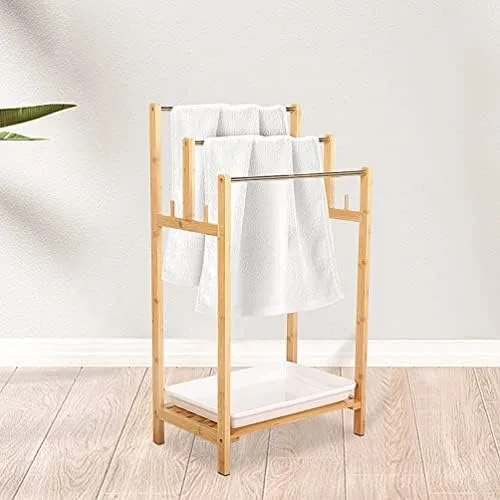 MYOYAY 3-Tier Bamboo Towel Rack Stand Pool Towel Holder 20"L x 12.2"W x 35"H Hand Towels Stand Holder Free Standing Blanket Rack with Bottom Storage Shelf Organizer for Bathroom, Bedroom, Living Room