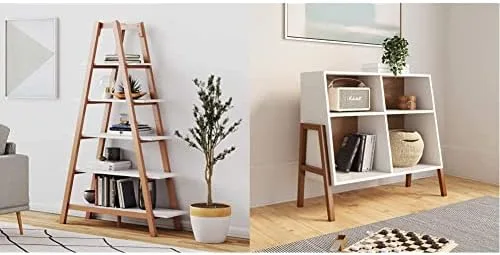 Nathan James is the furniture company built for this generation. You don’t need to spend a fortune to get quality design-first furniture and when we say easy assembly, We mean it. your purchase is backed by a 100% money-back . If you have any quality issues just contact us and we will send you a replacement immediately questions asked. carlie is a modern multi-functional 5-tier ladder shelf bookcase or display rack with a natural rove brown wood finish and white shelves that has clean lines with an open airy design. The stained rubber wood frame forms two sharp angles That provide structure and strength while displaying your decorations or can even be used as a plant stand. materials: -mdf engineered wood>-rubber wood assembly must-haves: -scissors weight limit: 75 lbs.