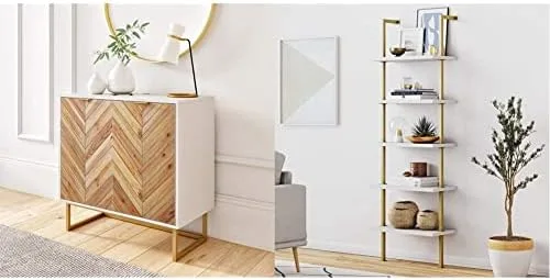 Enloe is a beautiful hideaway storage cabinet piece that demands attention with its rustic solid wood doors decorated in a sleek, elegant, herringbone design. Enloe has a clean white painted frame and brass powder-coated legs that have footpads attached to keep your floors from being scratched. With two swinging doors, this cabinet offers plenty of hidden storage and enough space to keep your home clutter-free, plus, you can adjust the shelves in the storage cabinet for the perfect amount of space. Nathan James is the furniture company built for this generation. You don’t need to spend a fortune to get quality design-first furniture and when we say easy assembly, we mean it. Our is our word. Your purchase is backed by a 100% money-back . If you have any quality issues just contact us and we will send you a replacement immediately—no questions asked. Materials: – Natural Wash Fir Wood – NC Matte White Paint Particleboard- Light Gold PC with Painted Top-coat MetalAssembly Must-Haves: -Scissors-Phillips-head screwdriver Weight Limit: -90 lbs. table-top-20 lbs. per shelf