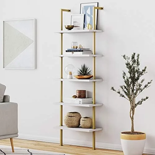 Nathan James Theo 5-Shelf Modern Bookcase, Open Wall Mount Ladder Bookshelf with Industrial Metal Frame, White/Gold