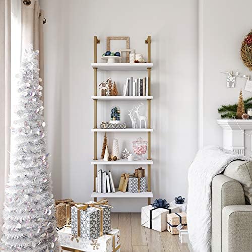 Nathan James Theo 5-Shelf Modern Bookcase, Open Wall Mount Ladder Bookshelf with Industrial Metal Frame, White/Gold
