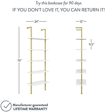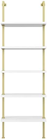 Nathan James Theo 5-Shelf Modern Bookcase, Open Wall Mount Ladder Bookshelf with Industrial Metal Frame, White/Gold