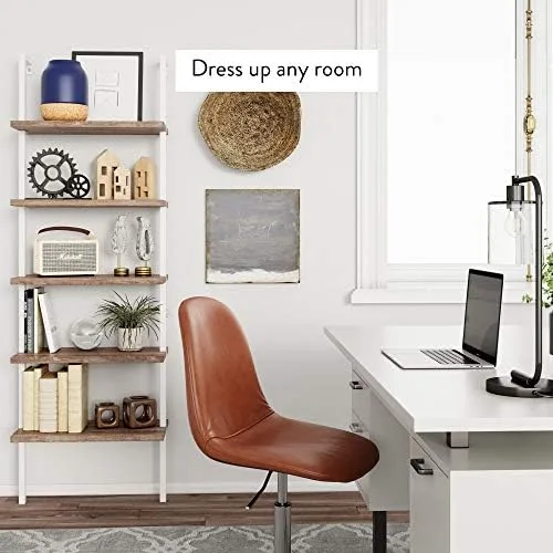 Product 2: The Theo Industrial Ladder Shelf is built with a durable metal frame and oak-laminate reclaimed wood for a vintage look.